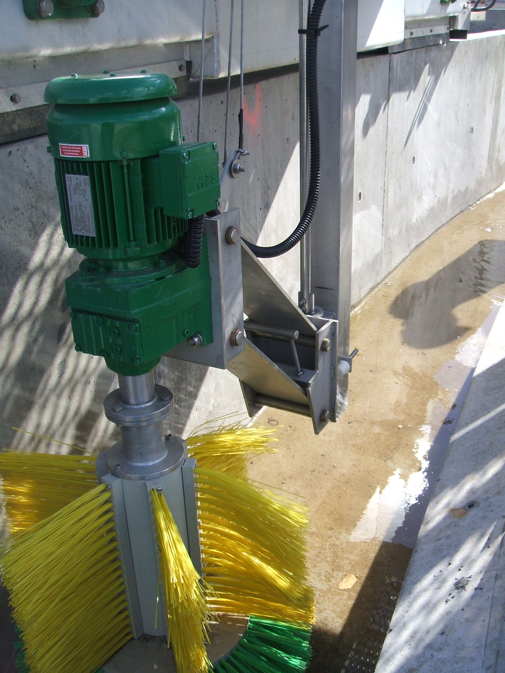 La brosse rotative de nettoyage est conçue pour éliminer en continu les dépôts, algues et biofilms formés sur les parois et goulottes des clarificateurs. Installée sur le pont racleur ou sur un support dédié, elle fonctionne par rotation lente et régulière, assurée par un motoréducteur étanche.