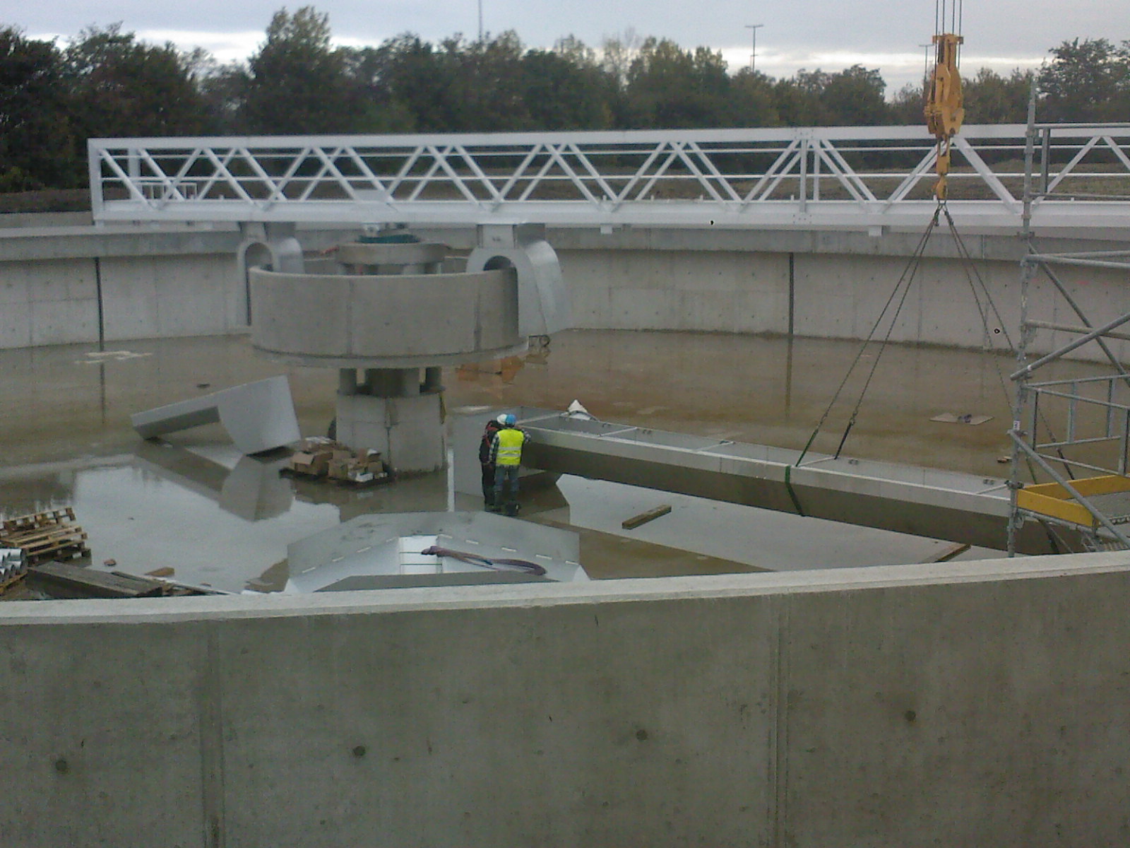 L’unité se compose d’une cuve cylindrique ou tronconique équipée d’un pont racleur assurant la sédimentation et le compactage progressif des boues. Au centre, un puits d’alimentation reçoit les boues diluées et favorise leur répartition homogène dans la cuve. Ce puits peut être muni d’un système d’injection de floculant, permettant une meilleure agglomération des particules et une sédimentation accélérée, gage d’un épaississement plus efficace.